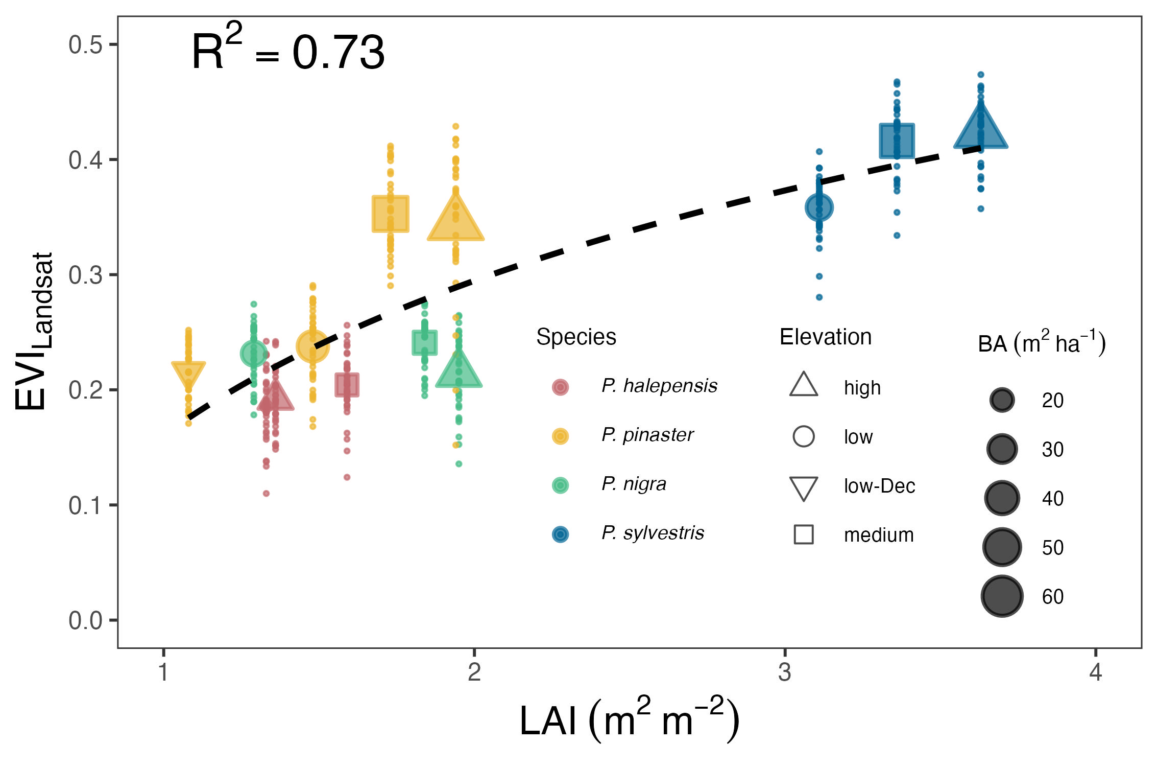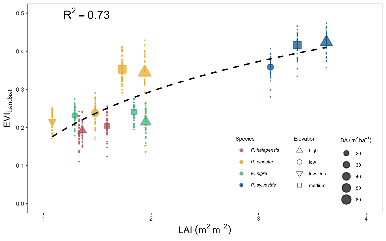 Relationship between Leaf Area Index (LAI, \(m^{2} \cdot m^{-2}\)) and the Enhanced Vegetation Index (\(EVI_{Landsat}\)) across the studied sites. Small dots represent annual EVI values while larger dots represent average value of EVI in each study site. The size of big dots is proportional to the basal area of the study sites (\(m^2 \cdot ha^{-1}\)).