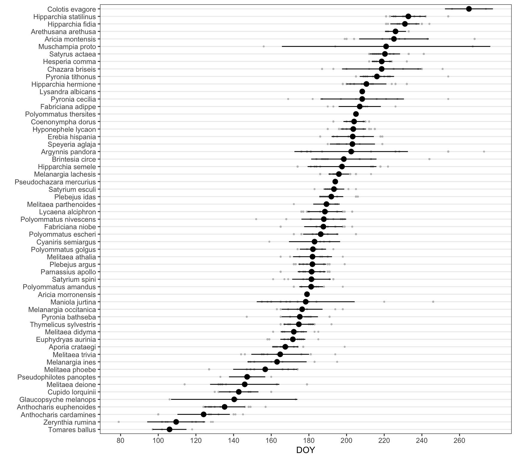 ggplot(aes(x=reorder(species, doy, mean), y = doy)) + geom_point(size=.5, colour = "gray") +